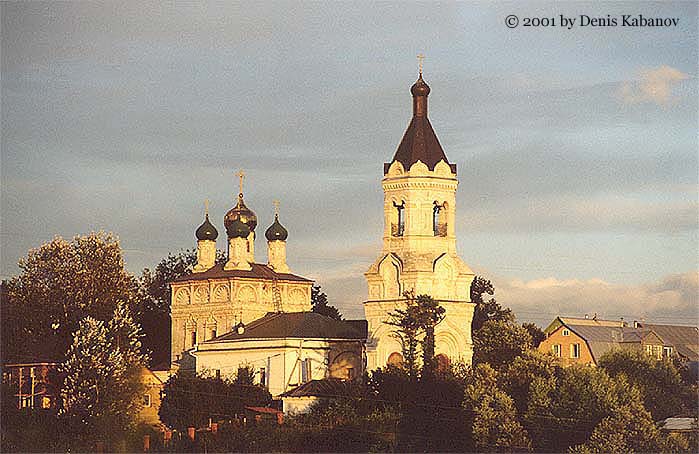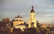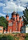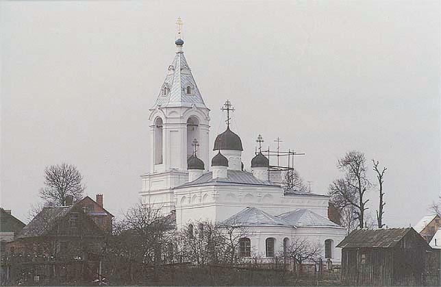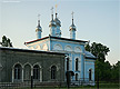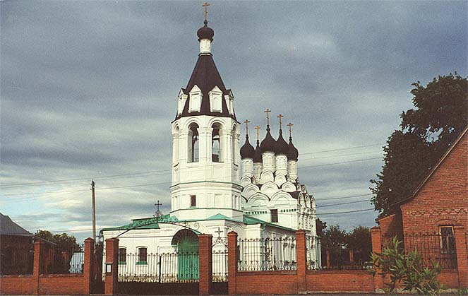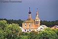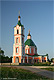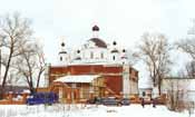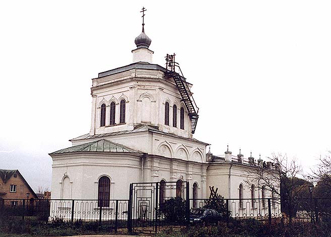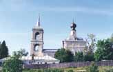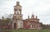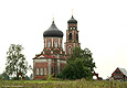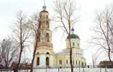 луковичными главами. С запада к нему примыкает двухпридельная трапезная, декорированная в стиле ампир и трехъярусная колокольня в псевдорусском
