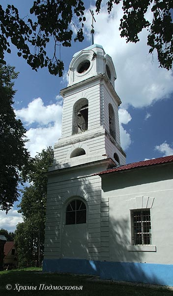 притвора и двухъярусной четверогранной колокольни под невысоким шатром. В настоящее время здание обстроено, венчания разобраны.