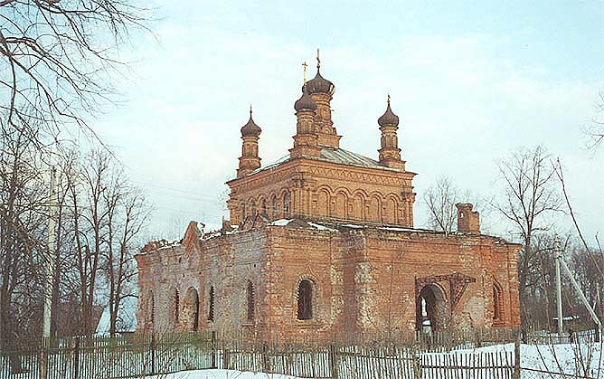кокошников и увенчан пятью луковичными главами. С запада к храму примыкают небольшая трапезная и двухъярусная шатровая колокольня,