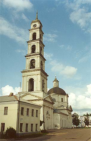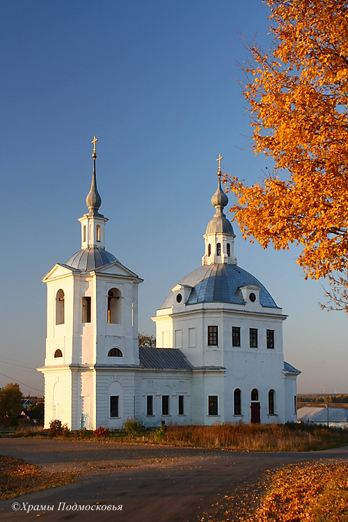 главкой на двухъярусном барабане. С востока к нему примыкает алтарь, с запада небольшая трапезная и трехъярусная колокольня, завершенная восьмериком звона
