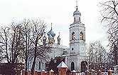 юга пониженные объемы приделов, а с запада трапезная, соединяющая церковь со стройной четырехъярусной шатровой колокольней.