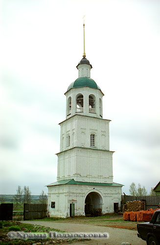 К трапезной с запада пристроена колокольня в три кубических яруса, увенчанная куполом со шпилем (утрачен).