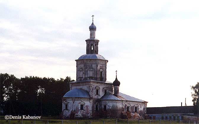 барабан, завершенный шатром с главкой. Фасады церкви прорезаны окнами в одинаковых наличниках, над центром боковых фасадов