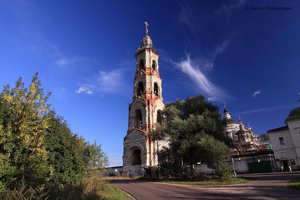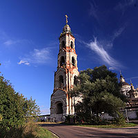 Четырехъярусная колокольня со шпилем обработана парными пилястрами, пвторяющими портики храма.