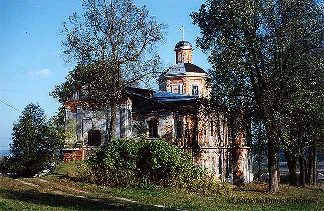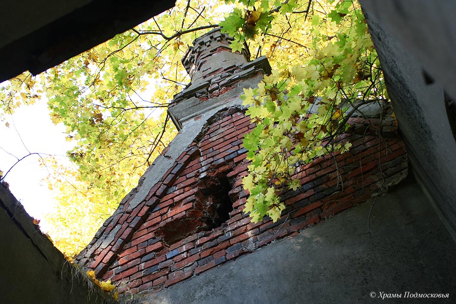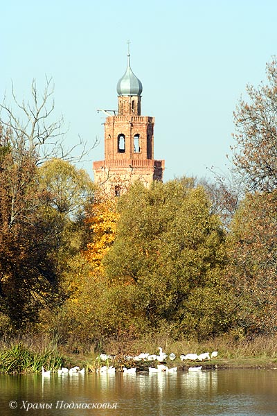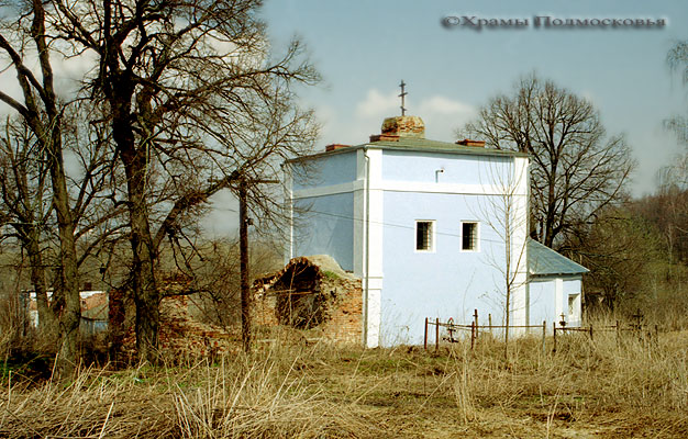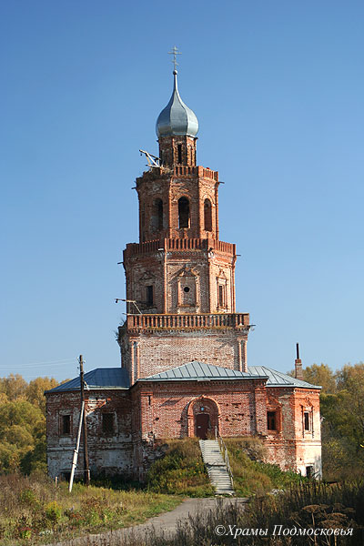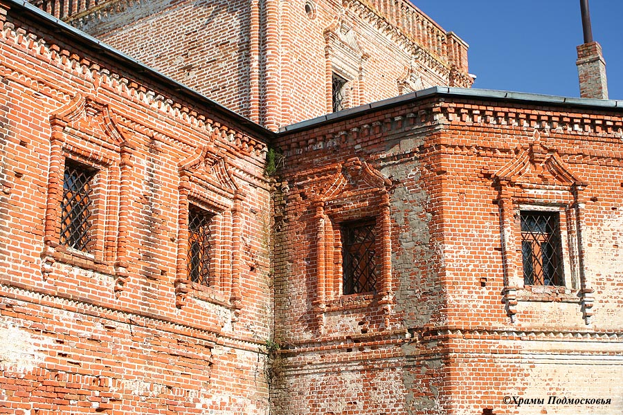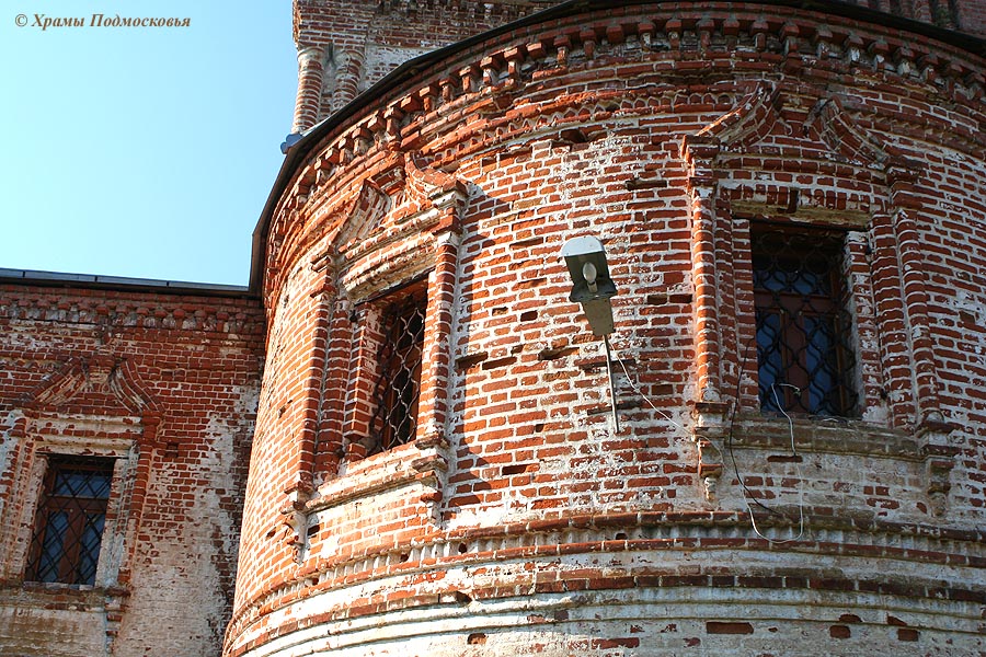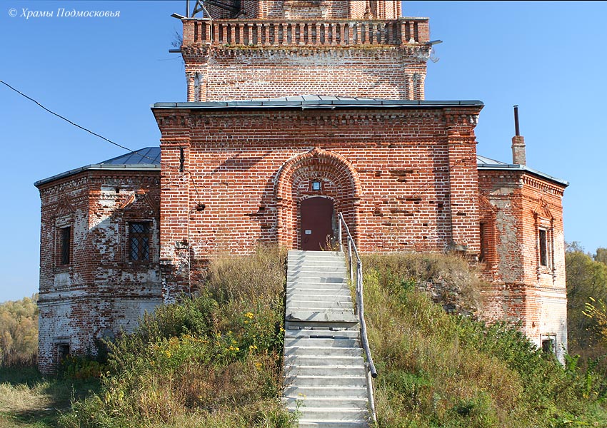 | Уникальный в этой части Подмосковья памятник: многоярусный храм, стоящий на высоком подклете. В плане здание церкви крестообразно, однако симметрия плана нарушается различиями в площади и конфигурации лепестков основания - алтарь полукруглый, боковые притворы пятигранные, а к четырехгранному западному притвору примыкает далеко вынесенная открытая лестница. Над четырехлепестковым основанием поднимается верхняя часть четверика храма, на котором поставлен световой восьмерик. Над последним поднимается меньший по размерам восьмерик "звона", увенчанный барабаном с небольшой луковичной главкой. Большая часть деталей декора церкви - карнизы, полуколонки на углах, наличники окон и порталы - восходит к допетровской архитектуре. Любопытной особенностью памятника являются декоративные глухие парапеты с кирпичными столбиками над карнизами, опоясывающими четверик и оба восьмерика.