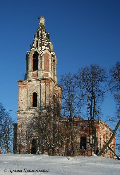 кокошники. С востока к церкви примыкает алтарь, с запада - трапезная, соединяющая ее с колокольней. Приземистая колокольня,