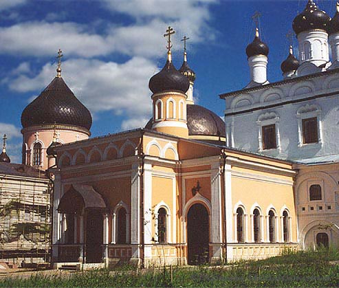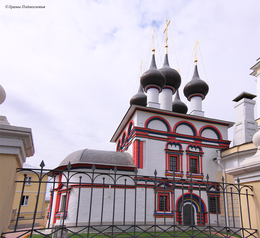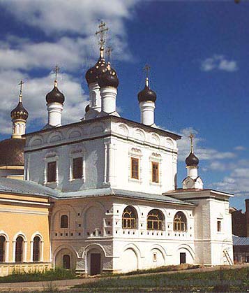 пятью декоративными луковичными главами. С востока к нему примыкает трехчастный алтарь, с запада обширная трапезная со скругленными