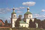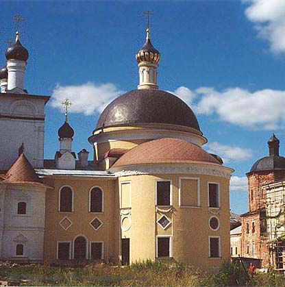 сводом и увенчан пятью небольшими луковичными главками, широко расставленными по кровле. С запада к церкви примыкают трапезная и